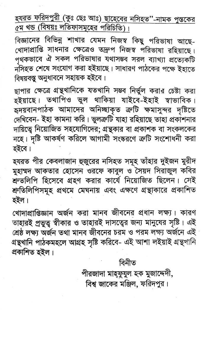 খোদাপ্রাপ্তি জ্ঞানের আলোকে শাহ্সুফী হযরত ফরিদপুরী (কুঃ ছেঃ আঃ) ছাহেবের নসিহত